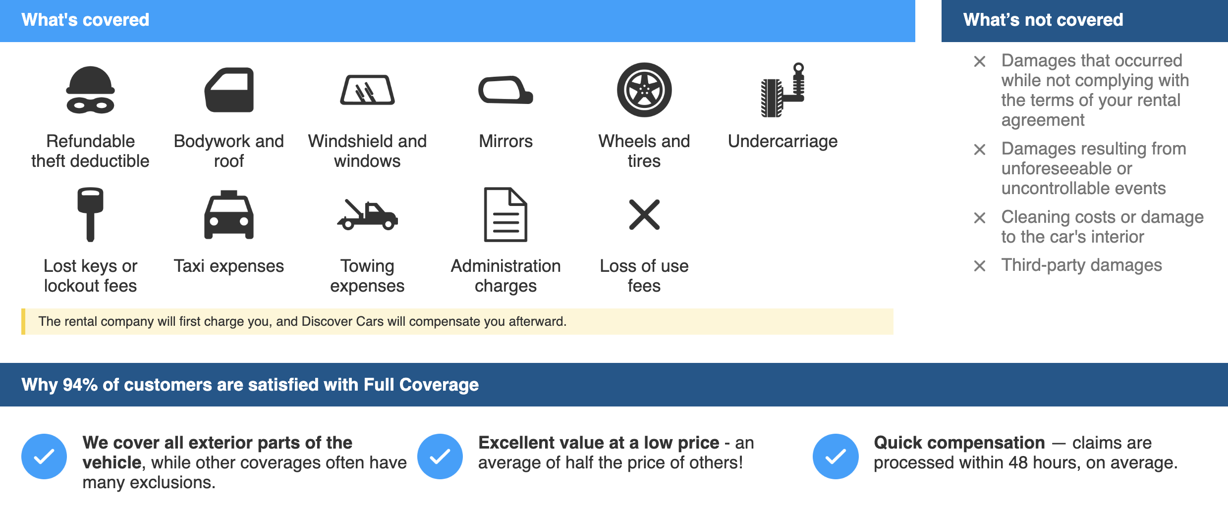 التأمين الشامل هو منتج إضافي تقدمه DiscoverCars.com لعملائنا لتغطية مبلغ التحمل لسيارتهم المستأجرة. وهو يعمل مع الحماية المتضمنة مثل التنازل عن أضرار التصادم والحماية من السرقة (إذا كانت مشمولة في التأجير) أو تأمين بطاقتك الائتمانية أو بوليصة تأمينك الخاصة للسيارة. عند شرائه، سيتم تعويضك عن أي رسوم عن الأضرار أو السرقة المغطاة حتى المبلغ المذكور.