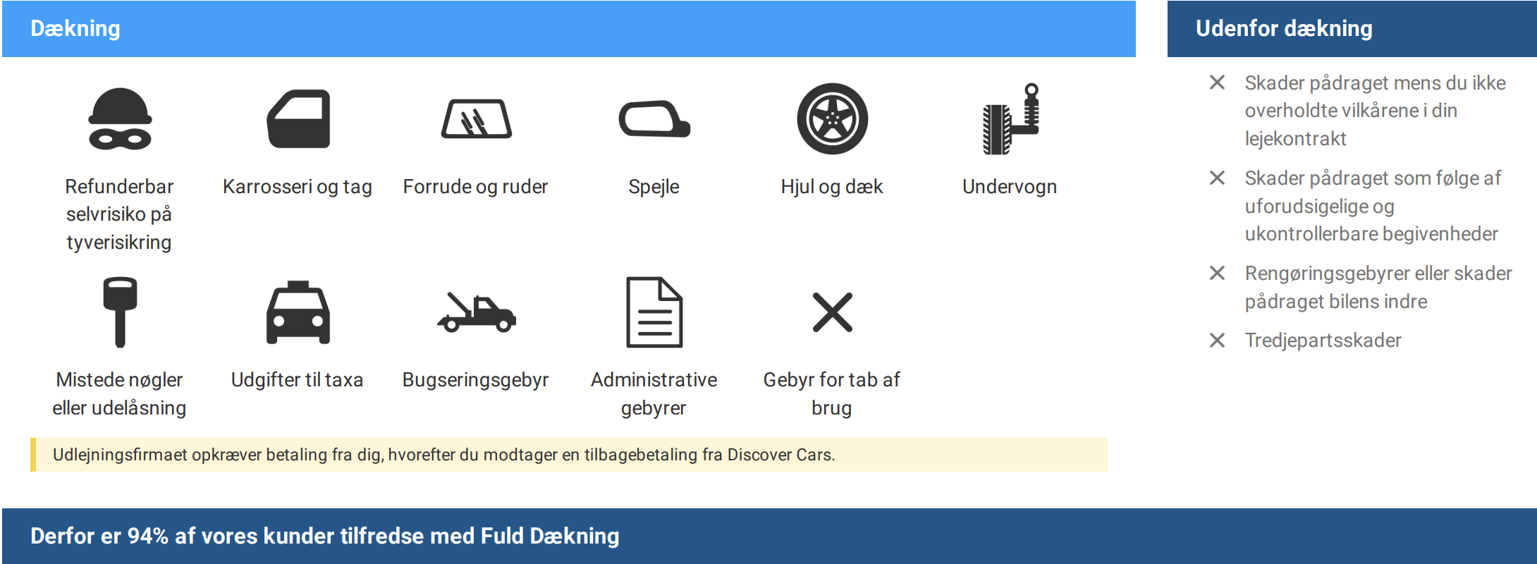 Fuld Dækning er et ekstra produkt fra DiscoverCars.com, der dækker selvrisikoen på din lejebil. Det hører sammen med beskyttelse såsom Kaskoforsikring og Tyverisikring (hvis dette er inkluderet i lejemålet), kreditkort-forsikring og en personlig forsikringspolitik. Når du køber Fuld Dækning, kan du få pengene tilbage for eventuelle skader og tyveri op til det valgte beløb.